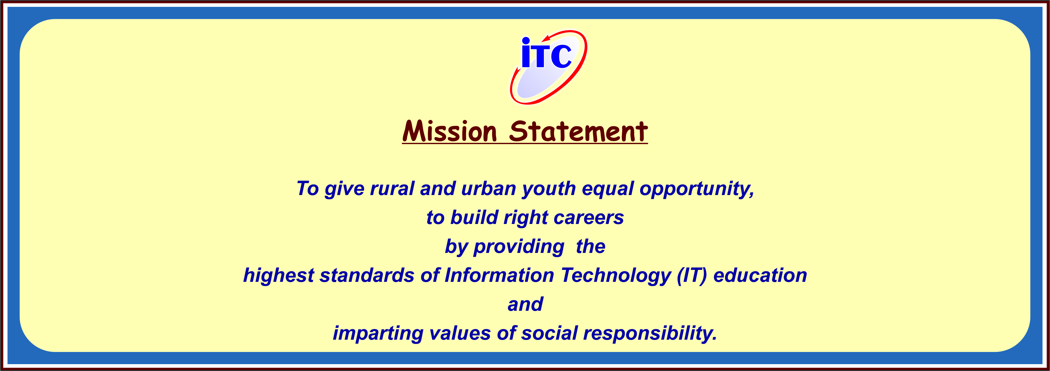 Information Technology Centre(ITC) was established in 1988 and is now one of the largest paragon Computer Training Segments in Gujarat, India. ITC is able to successfully fulfill its vision through its rural location in Mogri, Gujarat. This allows youth from all areas to gain access to the high level of IT education that ITC offers. ITC is managed by Anoopam Mission – a non-profit, multinational charity organization aiming at the upliftment of society through various social welfare projects. ITC is run by the Saints of Anoopam Mission, who are pivotal in encouraging a sense of moral and cultural responsibility.
